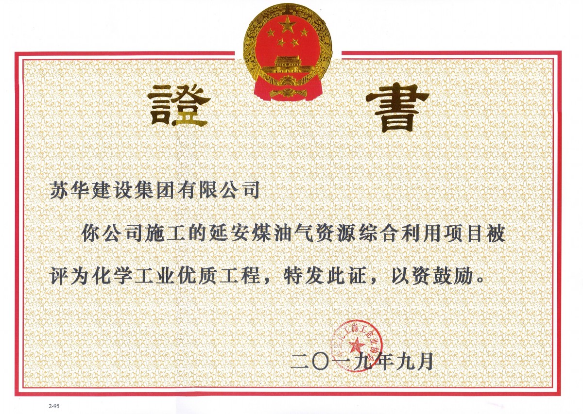 最近,我公司又獲得了由中國(guó)化工施工企業(yè)協(xié)會(huì)頒發(fā)的全國(guó)化學(xué)工業(yè)優(yōu)質(zhì)工程獎(jiǎng)狀。陜西延長(zhǎng)石油延安能源化工有限責(zé)任公司建設(shè)的延安煤油氣資源綜合利用項(xiàng)目熱動(dòng)力站項(xiàng)目。由我蘇華建設(shè)集團(tuán)有限公司上海分公司承建。該項(xiàng)...